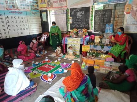 घोड़ाड़ोगरी। आंगनबाड़ी केंद्र ओझाडाना पर राष्ट्रीय पोषण माह के अंतर्गत पोषण आहार सप्ताह का आयोजन किया गया। राष्टीय पोषण आहार माह 1 सितंबर से 30 सितम्बर तक सभी केन्द्रो पर मनाया जा रहा है इसमें आंगनबाड़ी केंद्रों की कार्यकर्ता/ सहायिका द्वारा केंद्र के सभी 2 वर्ष से 6 वर्ष के बच्चो की माताओ को बताया गया कि अपने बच्चों को विभिन्न प्रकार के आहार दे जैसे – मिश्रित अनाज का दलिया, मूग दाल चीला, सूजीउपमा, दूध , मौसमी फल एवं सब्जियां देने के बारे में सम्पूर्ण जानकारी दी जा रही है। तृतीय सप्ताह में आंगनवाड़ी केंद्र ओझाडाना में रंगोली एवं पोषण प्रदर्शनी लगा कर माताओ को स्थानीय स्तर पर उपलब्ध खाद्य सामग्री के द्वारा बच्चों को पोष्टिक आहार बनाकर खिलाने के बारे मे परामर्श दिया गया 2 वर्ष से 6 वर्ष के बच्चो को कैसा और कितनी मात्रा में आहार देना चाहिए, भोजन को पोष्टिक कैसे बनाया जाय एवं प्रति माह बच्चों का वजन करा कर बच्चे की बृद्धि निगरानी करना चाहिए इसके बारे में पर्यवेक्षक अनामिका छारी द्वारा बताया गया। कार्यक्रम में ANM संगीता केवड़े द्वारा गर्भवती महिला एवं बच्चो को लगाए जाने वाले सम्पूर्ण टीकाकरण की जानकारी दी एवं आयरन गोलियों के सेवन के बारे में बताया गया साथ ही कोविड-19 को ध्यान में रखते हुए मुंह पर मास्क का प्रयोग करने की, हाथों पर सैनिटाइजर लगाने और बार बार हाथ धोने की एवं सोशल डिस्टेंस का पालन करने की सलाह दी गई कार्यक्रम में शामिल आंगनवाड़ी कार्यकर्ता बसन्ती इवने,अर्चना सावंत, रेखा झारवड़े,रेखा नागले,सहायिका निर्मला और बच्चो की माताएं उपस्तित रही।