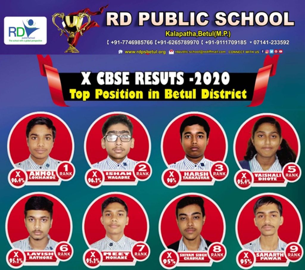 बैतूल। बैतूल जिले के बहुप्रतिष्ठित शैक्षणिक संस्थान आर.डी.पब्लिक स्कूल के छात्र-छात्राओं ने कक्षा 10वीं की सीबीएसई बोर्ड परीक्षा में 8 छात्र-छात्राओं ने जिले की टॉप टेन सूची में अपना परचम लहराया है। बैतूल जिले के इतिहास में ऐसा पहला अवसर पर है कि एक ही विद्यालय के 8 छात्र-छात्राओं ने जिले की टॉप टेन सूची में अपना नाम दर्ज कराया है। आर.डी.पब्लिक स्कूल के टैलेंटेड शिक्षक-शिक्षिकाओं के कठोर परिश्रम एवं उनके अथक प्रयासों से आज छात्र-छात्राओं ने इस मुकाम को हासिल किया है । घोषित परीक्षा परिणामों में जिले की टॉप टेन सूची में अपनी अमीट छाप छोडऩे वाले छात्रों में प्रथम स्थान पर अनमोल लोखण्डे 96.4 प्रतिशत अंको के साथ तथा, ईशान वाग्रदे दूसरे स्थान पर 96.2 प्रतिशत अंक, तीसरे स्थान पर हर्ष तरकवास 96 प्रतिशत, पांचवे स्थान पर कु. वैशाली धोटे 95.4 प्रतिशत, छटवें स्थान पर लविश राठौर 95.2 प्रतिशत, सातवे स्थान पर मीत मोहने 95.2 प्रतिशत, आठवे स्थान पर शिवम सिंह चौहान 95 प्रतिशत तथा 9वें स्थान पर समर्थ पंवार 95 प्रतिशत अंक लेकर आर.डी.पब्लिक स्कूल को गौरविन्त किया है। यही नहीें 44 विद्यार्थियों ने 90 फीसद से अधिक अंक अर्जित किए है तथा 4 विद्यार्थियों ने सोशल स्टडी में 100 में से 100 अंक हासिल कर विद्यालय का नाम पूरे प्रदेश में रौशन किया है। विद्यालय परिवार की तरफ से परीक्षा में अभूतपूर्व सफलता प्राप्त करने पर सभी विद्यार्थियों एवं कर्तव्यनिष्ठ शिक्षक-शिक्षिकाओं को हार्दिक बधाई-शुभकामनाएं।
