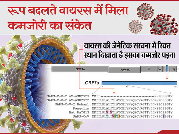 एरिजोना. कोरोना से पीड़ित दुनिया के लिए एक उम्मीद की किरण खुद वायरस की ओर से आई है। अमेरिका के एरिजोना में वैज्ञानिकों ने कोरोना के SARS-CoV-2 वायरस में ऐसे अनूठे म्यूटेशन (बदलाव) और जेनेटिक पैटर्न का पता लगाया है जो 17 साल पहले सार्स वायरस के संक्रमण के समय देखा गया था। ये म्यूटेशन वायरस प्रोटीन के बड़े हिस्से यानी इसके जेनेटिक मटेरियल का अपने आप गायब होना है।