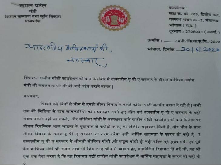 केंद्रीय गृहमंत्री अमित शाह को पत्र भेजकर कृषि मंत्री ने कहा है कि चीन से सीमा विवाद के चलते कांग्रेस लगातार अनर्गल बयान दे रही है। उन्होंने कहा कि मीडिया से मिल रही जानकारियों के आधार पर चीन एवं तत्कालीन यूपीए सरकार के गहरे संबंध नकारे नहीं जा सकते। सोनिया गांधी की अध्यक्षता वाले राजीव गांधी फाउंडेशन को दान के नाम पर पीपल रिपब्लिक ऑफ चायना के दूतावास से करोडों रुपए की वित्तीय सहायता मिली है। कमल पटेल ने कहा कि चीन के साथ जारी सीमा विवाद के दौरान पूर्व यूपीए सरकार का नरम रवैया इसी आर्थिक सहायता के कारण तो नहीं रहा।
