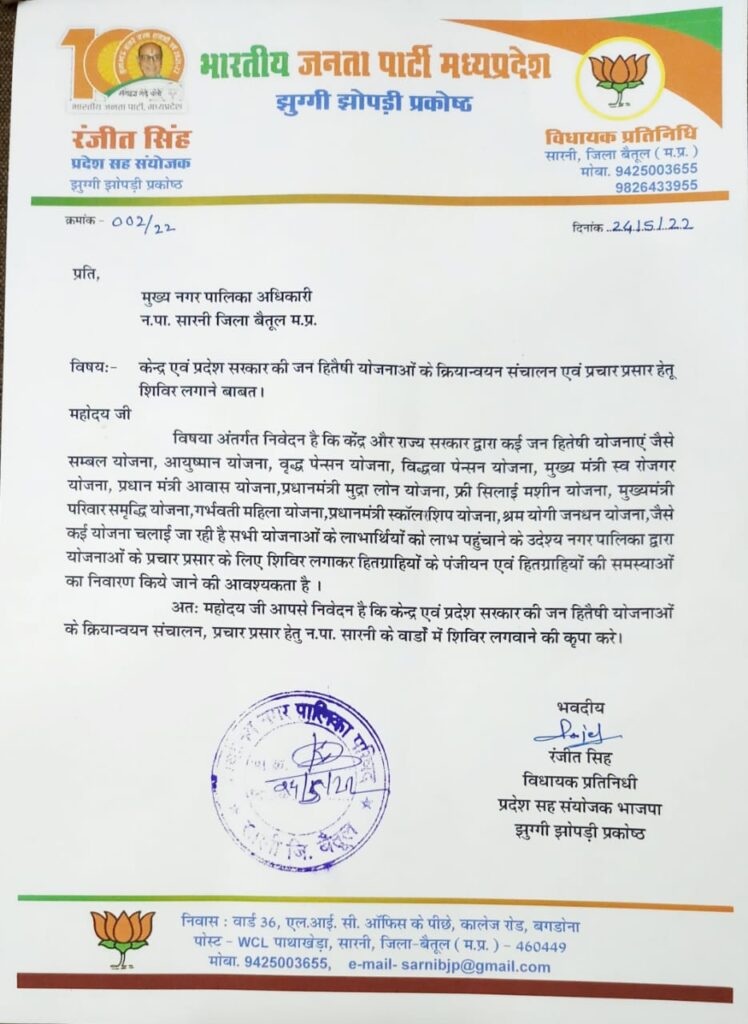 सारनी। भारतीय जनता पार्टी प्रदेश झुग्गी झोपड़ी प्रकोष्ठ के सह संयोजक एवं विधायक प्रतिनिधि रंजीत सिंह ने पत्र लिखकर मुख्य नगरपालिका अधिकारी को केंद्र और राज्य सरकार द्वारा कई जन हितेषी योजनाएं जैसे सम्बल योजना, आयुष्मान योजना, वृद्वा पेन्शन योजना, विद्धवा पेन्शन योजना, मुख्य मत्री स्व रोजगर योजना, प्रधान मंत्री आवास योजना,प्रधानमंत्री मुद्रा लोन योजना, फ्री सिलाई मशीन योजना, मुख्यमंत्री परिवार समृद्धि योजना,गर्भवती महिला योजना,प्रधानमंत्री स्कॉलरशिप योजना,श्रम योगी जनधन योजना,जैसे कई योजना के प्रचार प्रसार संचालन एवं क्रियान्वयन के लिए नगरपालिका के सभी झुग्गी बस्तियों के सभी 28 वार्डों में शिविर लगाने की मांग की है। प्रेस नोट जारी कर झुग्गी झोपड़ी प्रकोष्ठ के प्रदेश सह संयोजक एवं विधायक प्रतिनिधि रंजीत सिंह ने बताया कि केंद्र और प्रदेश की सरकार सैकड़ों जनकल्याणकारी योजनाएं चला रही है सभी योजनाओं के लाभार्थियों को लाभ पहुंचाने के उद्देश्य नगर पालिका द्वारा योजनाओं के प्रचार प्रसार के लिए शिविर लगाकर हितग्राहियों के पंजीयन एवं हितग्राहियों की समस्याओं का निवारण किये जाने की आवश्यकता है। इसलिए मुख्य नगरपालिका अधिकारी से मुलाकात एव पत्र लिखकर केन्द्र एवं प्रदेश सरकार की जन हितैषी योजनाओं के क्रियान्वयन संचालन,प्रचार प्रसार हेतु नपा सारनी के पाथाखेड़ा, शोभापूर,सारनी के 36 वार्ड है जिसमे 28 वार्डों में झुग्गीवासी निवास करते हैं ऎसे वार्डों मे शिविर लगवाने की मांग की है। मुख्य नगरपालिका अधिकारी ने आश्वस्त किया है कि नगरपालिका क्षेत्र में शिविर लगाकर हितग्राहियों को योजना की जानकारी दी जाएगी साथ ही तत्काल शिविर में ही समस्याओं का समाधान भी किया जाएगा।