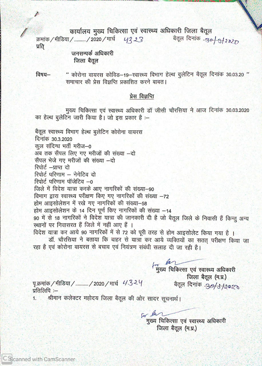 बैतूल। जिले वासियों के लिए एक बड़ी राहत भरी खबर आई है। जिला अस्पताल में भर्ती दोनों संदिग्ध कोरोना मरीजों की जांच रिपोर्ट निगेटिव आई है। किसी को भी कोरोना बीमारी नही है। सीएमएचओ जीसी चौरसिया ने बताया कि आठनेर क्षेत्र के एक गांव एवं भैंसदेही की एक किशोरी को संदिग्ध कोरोना बीमारी के चलते जिला अस्पताल में भर्ती किया था दोनों मरीजो के सैंपल जांच के लिए भेजे थे जिनकी जांच रिपोर्ट सोमवार को आई है। दोनों की रिपोर्ट निगेटिव आई है। जिले में कोई भी कोरोना का मरीज नही है। यह खबर सम्पूर्ण जिले वासियों के लिए राहत भरी खबर है। लेकिन अभी कोरोना का संकट गया नही है। सभी को सावधानी बरतने की जरूरत है और सभी लोग लॉकडाउन का पालन करें। घर पर ही रहे आपने आप को बीमारी से बचाये। बीमारी का कोई इलाज नही है