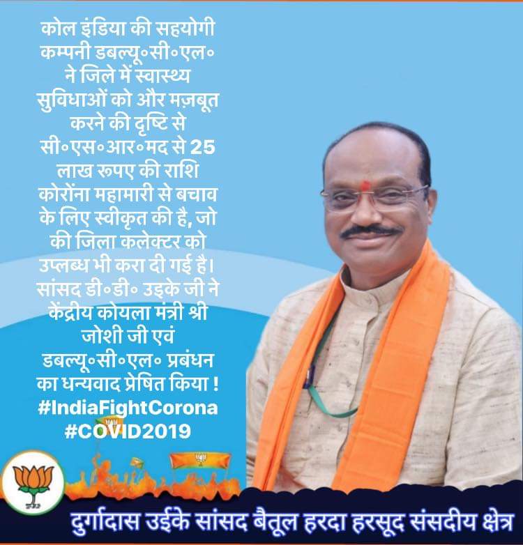 बैतूल। सांसद दुर्गादास उइके जी ने क्षेत्रीय विधायक डॉ.योगेश पंडागरे जी एवं प्रदेश कोषाध्यक्ष श्री हेमंत खण्डेलवाल जी,वेकोली मुख्य महाप्रबंधक श्री पी.के चौधरी जी के सहयोग से कोयला मंत्री श्री प्रह्लाद जोशी एवं WCL के CMD श्री राजीव रंजन मिश्रा से कोविड 19 महामारी को देखते हुए सी॰एस॰आर॰ फ़ंड से सहयोग के लिए आग्रह किया गया था !