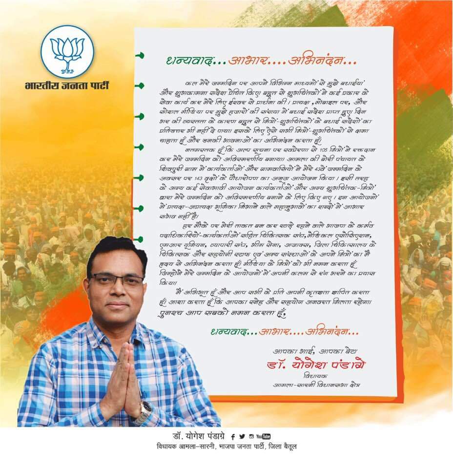 हर मौके पर मेरी ताकत बन कर खड़े रहने वाले भाजपा के कर्मठ पदाधिकारियों-कार्यकर्ताओं सहित चिकित्सक संघ, मेडिकल एसोसिएशन, एमआर यूनियन, व्यापारी संघ, भीम सेना, अजाक्स, जिला चिकित्सालय के चिकित्सक और सहयोगी स्टाफ एवं अन्य संस्थाओं के अपने मित्रों का मैं हृदय से अभिनंदन करता हूँ। मीडिया के मित्रों को भी नमन करता हूँ जिन्होंने मेरे जन्मदिन के आयोजनों में अपनी कलम से रंग भरने का प्रयास किया।