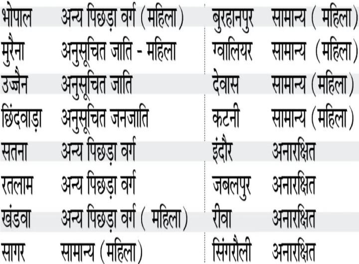 16 नगर निगमों के महापौर पद के लिए नया आरक्षण नहीं होगा। महापौर के लिए दिसंबर 2020 में कराई गई आरक्षण प्रक्रिया ही मान्य होगी। विशेष कर्तव्यस्थ अधिकारी एवं कमिश्नर नगरीय प्रशासन व विकास निकुंज कुमार श्रीवास्तव ने बताया कि नगर पालिका परिषद और नगर परिषदों के आगामी सामान्य निर्वाचन के लिए मध्यप्रदेश नगरपालिका (महापौर व अध्यक्ष पद का आरक्षण) नियम 1999 के अंतर्गत अध्यक्ष पदों के संशोधित आरक्षण की कार्रवाई की जाएगी। प्रदेश के 317 नगरीय निकायों में चुनाव होना हैं, जिनमें 16 नगर निगम भी शामिल हैं। महापौर पद के लिए आरक्षण नहीं होगा। प्रदेश में 16 नगर निगम, 99 नगर पालिका और 298 नगर परिषद हैं।