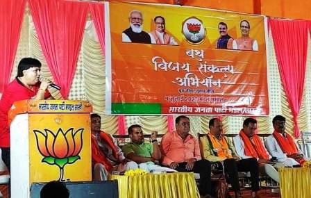 तत्पश्चात भाजपा जिला अध्यक्ष आदित्य बबला शुक्ला ने कार्यकर्ताओं को संबोधित करते हुवे कहाँ की भाजपा का लक्ष्य हर बूथ विजय का संकल्प है हमने हर बूथ पर 51 प्रतिशत के मत प्राप्ति का लक्ष्य रखा है संघठन की रचना के माध्यम से हम हर बुथ पर कार्यकताओं की फौज खड़ी कर चुके है। हर बूथ पर 51 प्रतिशत लक्ष्य के संकल्प के साथ हर कार्यकर्ता प्रण प्राण से जुट कर कार्य करना है। कार्यक्रम का संचालन मंडल के महामंत्री प्रकाश शिवहरे व आभार मंडल मंत्री विनय मदने ने किया। कार्यक्रम में प्रमुख रूप से मंडल पदाधिकारी जिला पदाधिकारी मोर्चा प्रकोष्ठ के मंडल पदाधिकारी जिला पदाधिकारी पार्षद गण बूथ के अध्यक्ष व बूथ समिति पन्ना समिति के सदस्य बड़ी संख्या में उपस्थित थे।