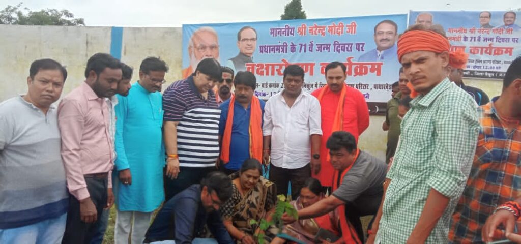 सारनी। नगर पालिका परिषद सारनी द्वारा प्रधानमंत्री माननीय नरेंद्र मोदी जी के 71 वें जन्मदिवस के उपलक्ष्य में *”जन कल्याण और सुराज के 20 वर्ष”* होने पर शुकवार 17 सितंबर 2021 को दोपहर 12 बजे से नगर पालिका क्षेत्र के वार्ड 22 शासकीय संजय निकुंज नर्सरी के समीप स्थित ट्रेचिंग ग्राउंड परिसर में पौधारोपण किया गया । इस अवसर पर नगर पालिका अध्यक्ष आशा महेंद्र भारती, उपाध्यक्ष भीम बहादुर थापा, भाजपा के वरिष्ठ नेता पीजे शर्मा, भाजपा के जिला महामंत्री कमलेश सिंह, विधायक प्रतिनिधि रंजीत सिंह, पूर्व मंडल अध्यक्ष सुधा चंद्रा, भाजपा के मंडल अध्यक्ष नागेंद्र निगम, मुख्य नगर पालिका अधिकारी सीके मेश्राम, नेता प्रतिपक्ष संजय अग्रवाल, सभापति बबलू वामनकर एवं पार्षदगण व जनप्रतिनिधि मौजूद थे। मुख्य नगर पालिका अधिकारी सीके मेश्राम ने बताया कि प्रदेश शासन के निर्देश पर प्रधानमंत्री माननीय नरेंद्र मोदी जी के जन्मदिवस के उपलक्ष्य में पौधारोपण किया गया। इस अवसर पर वार्ड 22 स्थित ट्रेचिंग ग्राउंड परसिर में विभिन्न प्रजाति के फलदार, छायादार पौधों का रोपण अतिथियों द्वारा किया गया। संजय निकुंज नर्सरी के कवर्ड कैंपस में रोपे गए पौधों की रक्षा के लिए ट्रीगार्ड भी लगाए गए हैं। परिसर में कटहल, मोरछली, अशोक, सप्तपर्णी, अमरूद, बादाम, जामुन, आम, आंवला के 100 पौधे लगाए गए। कार्यक्रम के मौके पर पार्षद श्रीमती सुनंदा पाटिल, रेवाशंकर मगरदे, संदीप झपाटे , अजय साकरे , संतोष देशमुख , जीपी सिंह , नपा के पूर्व नेता प्रतिपक्ष महेंद्र भारती , समीर मसीद , प्रकाश शिवहरे , जगदीश पवार , श्री विनय मदने , श्री विन्नी राय , श्री राहुल कापसे , प्रवीण सोनी , राजकुमार नागले . राकेश बारंगे , बाबू सिंह , रवि देशमुख, बंटी अग्रवाल, शिबू सिंह, प्रकाश डेहरिया, मोनू साहू, योगेश बर्डे, ग्राम भारती महिला मंडल से श्रीमती भारती अग्रवाल , नगर पालिका परिषद के स्वच्छता अधिकारी केके भावसार , उपयंत्री रविंद्र वराठे , केएल सोनारे , विनायक बागड़े , राजेश वागद्रे , जीएस पांडे , महेश शर्मा , जीवन बोहित , सुनील सहारे , सुनील यादव , गुरूस्वामी एरूलू , संजीत मंडल समेत अन्य जनप्रतिनिधि , अधिकारी , कर्मचारी मौजूद थे।