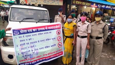 पुलिस अधीक्षक महोदय के निर्देशानुसार शहर के गोंडी मोहल्ला, मांझी ढाना, पीपल चौक, लल्ली चौक, कश्मीरा चौक, गंज बाजार एवं बसोड़ी मोहल्ला में महिलाओं ने आम जनता को सामाजिक बुराइयों से दूर रहने की अपील की एवं कोरोना संक्रमण को ध्यान में रखते हुए पोला व कर त्योहार मनाने की सलाह दी।