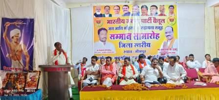 बैतूल। भारतीय जनता पार्टी द्वारा आयोजित समाजिक न्याय पखवाड़ा में अनुसूचित जनजाति मोर्चा बैतूल द्वारा स्व सहायता समूह की महिलाओ का सम्मान समारोह आयोजन भीमपुर में किया गया जिसमें अलग अलग क्षेत्रों से महिलाए सम्मिलित हुईं कार्यक्रम में उन्हें प्रशस्ति पत्र देकर सम्मानित किया। सम्मान समारोह के कार्यक्रम क्षेत्रीय सांसद दुर्गादास उइके ,भाजपा जिला अध्यक्ष आदित्य बबला शुक्ला,विधायक डॉ योगेश पण्डागरे,जिला पंचायत अध्यक्ष सूरज जावलकर ,पूर्व सांसद ज्योति धुर्वे,पूर्व महिला आयोग सदस्य गंगा उइके,पूर्व विधायक महेन्द्र सिंग चौहान, जनजाति मोर्चा जिला अध्यक्ष सीताराम चड़ोकर,भाजपा प्रदेश सह सयोंजक झुग्गी झोपड़ी प्रकोष्ठ एव कार्यक्रम प्रभारी रंजीत सिंग,भाजपा जनजाति मोर्चा प्रदेश मंत्री दीपक उइके, पूर्व मंडल अध्यक्ष राजेश आहूजा,भाजपा मंडल अध्यक्ष अनिल उइके,के अतिथि में संपन्न हुआ।कार्यक्रम में उपस्थित स्वसहायता समूह की महिलाओं को संबोधित करते हुए क्षेत्र के लोकप्रिय सांसद दुर्गादास उईके ने कहा कि