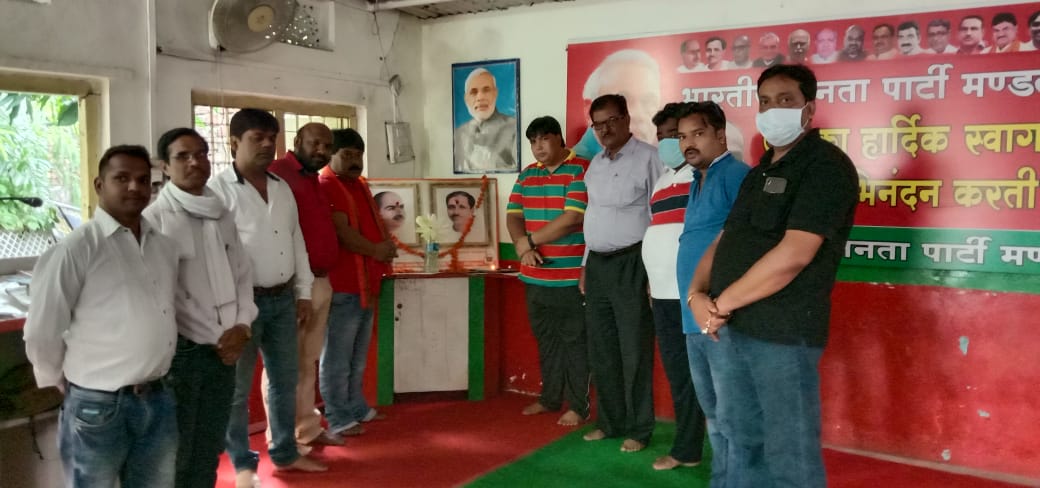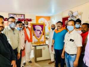 भाजपा कार्यकर्ता सोशल डिस्टेंसिगं का पालन करते हुए श्यामा प्रसाद मुखर्जी की मनाई पुण्यतिथि