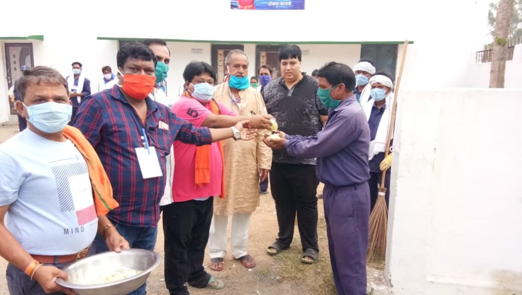 सारनी। 1 मई मजदूर दिवस के अवसर पर भारतीय जनता पार्टी मंडल सारनी में पूरे विश्व में व्याप्त कोरोना महामारी से युद्ध करने वाले ऐसे कोरोना वीर नगरपालिका के सफाई कर्मचारी के सम्मान का कार्यक्रम भारतीय जनता पार्टी मंडल सारनी में जिला मंत्री रंजीत सिंह, भाजपा मंडल अध्यक्ष सुधा चंद्रा, भाजपा महामंत्री किशोर बरदे, नगर पालिका उपाध्यक्ष भीम बहादुर थापा की उपस्थिति में सर्वप्रथम शोभापुर कॉलोनी में भाजपा के सहयोग से संचालित पंडित दीनदयाल अंत्योदय रसोई में सभी कोरोना योद्धाओं का पुष्पवर्षा कर सम्मान किया। उसके पश्चात उन सभी कोरोना योद्धाओं को शॉल श्रीफल देकर सम्मानित किया गया, शोभापुर कॉलोनी में कार्यरत कोरोना योद्धाओं को पोहा, जलेबी वितरण कर उनका सम्मान किया गया। उसके पश्चात सारणी के शिवाजी प्रांगण में सारनी में कार्यरत कोरोना योद्धाओं को गमछा श्रीफल देकर एवं पुष्पवर्षा कर सभी पार्षदों की उपस्थिति में उन्हें दोपहर का भोजन कराया गया। 1 मई से ही भारतीय जनता पार्टी मंडल सारनी में शिवाजी प्रांगण में दीनदयाल रसोई का प्रारंभ वार्ड क्रमांक 1, 2, 3, 4, 5 के तमाम उन जरूरतमंद और असहाय परिवारों के लिए भोजन व्यवस्था उपलब्ध कराने हेतु आम जनमानस के सहयोग के साथ दीनदयाल रसोई का भी शुभारंभ किया गया। मजदूर दिवस कोरोना योद्धाओं का सम्मान के कार्यक्रम में शोभापुर में समीर मसीद, प्रकाश शिवहरे, जगदीश पवार, वीरेंद्र सोलंकी, गुड्डू सोनी, मिश्रीलाल सोनी, देवेंद्र सोनी, सतीश चौरे आदि कार्यकर्ता उपस्थित थे। और सारनी सेक्टर में रेवाशंकर मगरदे, सुनंदा पाटिल, राकेश सोनी, राजकुमार नागले, धर्मेंद्र वर्मा, विनोद झरबडे, सुनिल माखोड़े, राहुल कापसे, विनय मदने, हेमराज नागले, असीम मंडल, सुनिल पाटील आदि सभी कार्यकर्ताओं उपस्थित थे। इस अवसर पर सोशल डिस्टेंस का पालन करते हुए योद्धाओं का सम्मान का कार्यक्रम एवं पंडित दीनदयाल उपाध्याय अंत्योदय रसोई शुभारंभ का कार्यक्रम को संपन्न किया।