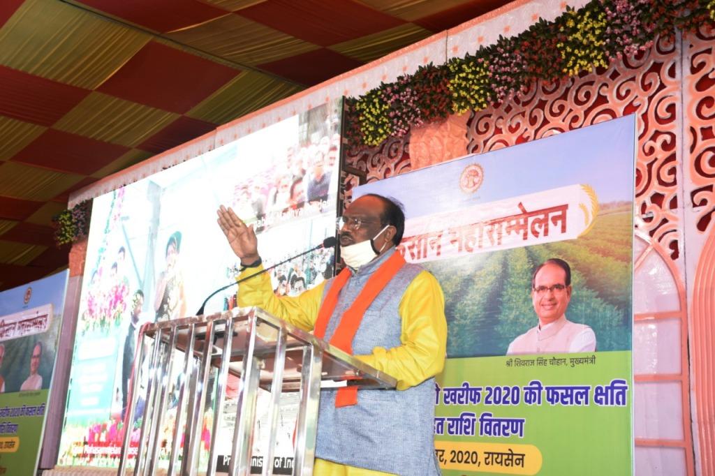 प्रधानमंत्री श्री नरेन्द्र मोदी ने आज प्रदेश के रायसेन में आयोजित किसान महासम्मेलन में प्रदेश के 50 लाख से अधिक किसानों को सीधे (वर्चुअली) संबोधित किया। किसान कार्यक्रम स्थल से तथा प्रदेश के सभी जिला, जनपद तथा ग्राम पंचायतों से वर्चुअली जुड़े थे। कार्यक्रम में मुख्यमंत्री श्री चौहान ने प्रदेश के साढ़े 35 लाख किसानों के खातों में फसल नुकसानी की प्रथम किश्त के रूप में 1600 करोड़ रूपए की राशि अंतरण की शुरूआत की। मुख्यमंत्री श्री चौहान द्वारा कार्यक्रम में 70 करोड़ रूपए से अधिक के कृषि अधोसंरचना विकास के कार्यों का शिलान्यास/लोकार्पण किया। इसके साथ ही 2 हजार मछुआ पालक एवं पशुपालकों को किसान क्रेडिट कार्ड का वितरण भी किया गया। कार्यक्रम में सांसद श्री श्री व्ही.डी. शर्मा कृषि मंत्री श्री कमल पटेल, स्वास्थ्य मंत्री डॉ. प्रभुराम चौधरी आदि उपस्थित थे।