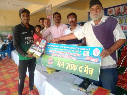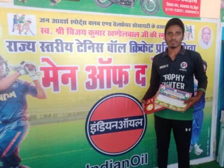 सारनी। स्व. विजय कुमार खण्ड़ेलवाल जी स्मृति राज्य स्तरीय टेनिस बाल क्रिकेट प्रतियोगिता के सोलहवे दिन 3 मैच खेले गए। आज के दिन का पहला मैच रॉयल क्लब देव पिपरिया एवम ट्रॉफी फाइटर भौरा के बीच खेला गया  रॉयल क्लब देव पिपरिया ने टॉस जीतकर क्षेत्ररक्षण करने का निर्णय लिया पहले बल्लेबाजी करते हुए ट्रॉफी फाइटर भौरा ने निर्धारित 10 ओवर में 9 विकेट खोकर 130 रन बनाए । 131 रनों के लक्ष्य का पीछा करने उतरी रॉयल क्लब देव पिपरिया ने 10 ओवर में ऑल आउट होकर 71 रन ही बना पाई यह मैच 50 रन से हार गई इस मैच के मैन ऑफ द मैं लोकेश सेन जिन्होंने गेंदबाजी मे 3 विकेट हासिल किया एवं बल्लेबाजी से 35 रन बनाए और मैन ऑफ द मैच बने । दूसरा मैच अंकित इलेवन टिमरनी एवं वंदे मातरम जामई के बीच खेला गया अंकित इलेवन टिमरनी ने टॉस जीतकर पहले बल्लेबाजी करने का निर्णय लिया पहले बल्लेबाजी करते हुए अंकित इलेवन टिमरनी ने 10 ओवर में 9 विकेट खोकर 69 रन बनाए 70 रनों के लक्ष्य का पीछा करने उतरी वंदे मातरम टिमरनी ने 6 विकेट खोकर 70 रनों के लक्ष्य को हासिल किया और यह मैच जीत गए इस मैच के मैन ऑफ द मैच तौकिर रहे जिन्होंने 16 गेंदों पर 20 रन बनाए और गेंदबाजी में 2 ओवर डालकर 2 विकेट हासिल किए और मैन ऑफ द मैच बने । आज के दिन का तीसरा मैच ट्रॉफी फाइटर भौरा एवं वंदे मातरम जामई के बीच खेला गया टॉस जीतकर ट्रॉफी फाइटर भौरा ने पहले बल्लेबाजी करते हुए निर्धारित 10 ओवरों मैं 9 विकेट खोकर 66 रन बनाए 67 रन का लक्ष्य का पीछा करने उतरी ने वंदे मातरम जामई ने निर्धारित 7 ओवर में 67 रन बनाकर यह मैच 6 विकेट से जीत लिया इस मैच के मैन ऑफ द मैच तौकीर जिन्होंने बल्लेबाजी में  9 रन मारे और गेंदबाजी में 2 विकेट हासिल कर मैन ऑफ द मैच बने। आज के अतिथी पूर्व सारनी व्यापारी संघ अध्यक्ष बिट्टू सरदार, ओमप्रकाश सिंह, पूर्व पार्षद नरेंद्र उघडे, अमित रघुवंशी, संतोष जत्ती, अजय प्रजापति, बिट्टू बिंझाडे,जीपी सिंह  संतोष राजेश, योगेश बर्डे, नोखेलाल गोहे उपस्थित थे। इस अवसर पर संरक्षक रंजीत सिह, जीपी सिह, खुशीलाल पवार,किशोर ड़ेहरिया, अजय प्रजापति,गणेश महस्की, संजीत चौधरी,मिंटू वोहरा,दिलीप विश्वकर्मा,  लक्ष्मण साहू, उपस्थित थे।