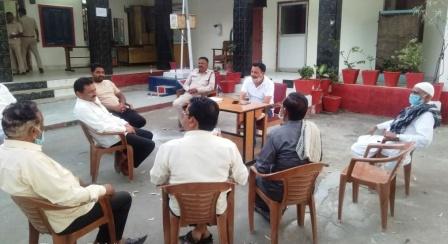 सारनी। ईद मिलादुन्नबी त्यौहार को देखते हुए थाना परिसर में मुस्लिम समाज के पदाधिकारियों की टीआई महेंद्र सिंह ने बैठक ली। इस बैठक में जुलूस निकालने पर चर्चा हुई। मुस्लिम समाज के पदाधिकारियों ने जुलूस में कोविड 19 का पालन करने एवं 60 साल के बुजुर्ग तथा 10 साल से छोटे बच्चों को जुलूस में शामिल नही करने पर सहमति बनी है। टीआई महेंद्र सिंह ने कहा कि एसडीएम साहब की अनुमति के बाद ही जुलूस निकाल सकते हैं। जिला प्रशासन एवं शासन के निर्देश का पालन सभी को करना जरुरी है। अंजुमन कमेटी जामा मस्जिद के सचिव अब्दुल रहमान खान ने कहा कि जिला प्रशासन के आदेशों का पालन किया जाएगा। इस मौके पर अंजुमन कमेटी पाथाखेड़ा अध्यक्ष शमीम अंसारी,सचिव सगीर कुरेशी,सारणी अजुमन कमेटी अध्यक्ष रफी अहमद,मो ताज,मोहम्मद इलियास,राफे बक्स,शेख चमन आदि मौजूद थे।