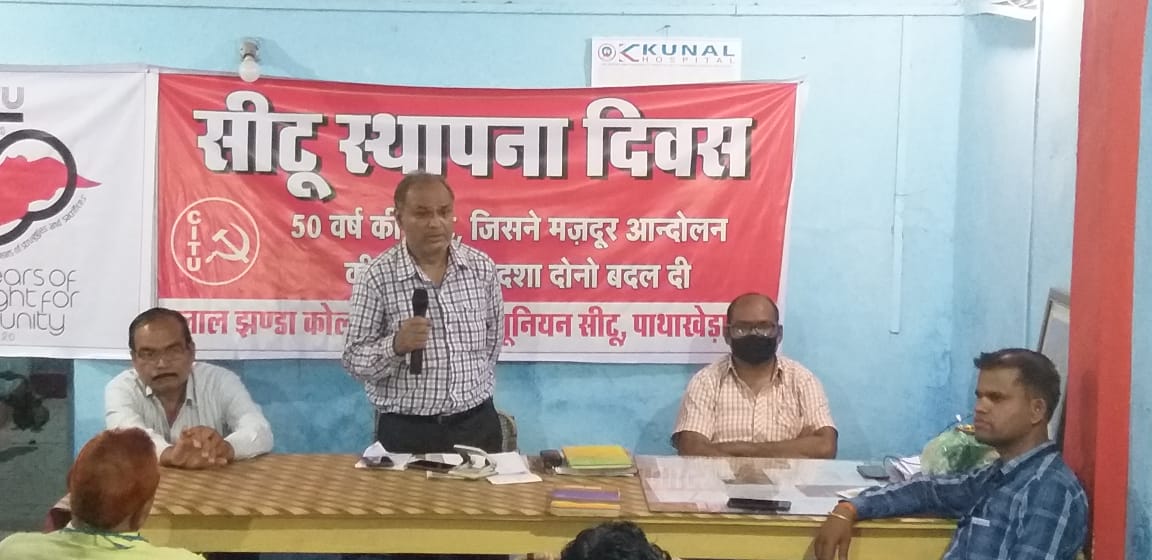 सारनी। सेंटर ऑफ इंडियन ट्रेड यूनियन (सीटू) की स्थापना के 50 वर्ष पूरा होने पर सीटू पाथाखेड़ा एरिया में स्थापना दिवस मनाया गया। सीटू राज्य कमेटी सदस्य कालिका प्रसाद, एरिया महामंत्री अशोक बुन्देला ने जानकारी देते हुए कहा कि कोरोना महामारी की वजह से स्थापना दिवस सोशल डिस्टेंस को ध्यान में रखते हुए मनाया गया। और श्रम कानून मे संशोधन व काम के घंटे को 12 घंटे करने के खिलाफ सभी मजदूरों को संगठित किया जाएगा। उन्होंने बताया कि लॉकडाउन के नियमों का पालन करते हुए मजदूरों के संघर्ष की पहचान हंसुआ हथौड़ा युक्त झंडे के समक्ष मशालें लिये सीटू पाथाखेड़ा कार्यकर्ताओं ने इस पचासवें स्थापना को मनाया। आज से पचास साल पहले हुई थी सीटू की स्थापना, कलकत्ता में 26 मई से 30 मई तक एक समेलन हुआ। जिसमें श्रमिकों किसानों और देश के हर मज़दूर वर्ग की लड़ाई को लड़ने के लिये 30 मई सन्न 1970 को स्थापित हुआ। पूरी दुनिया में सिर्फ एक ऐसा संगठन हैं पूरी दुनिया के मज़दूरों कि लडाई मे आगे रहता है। सीटू महासचिव अशोक बुन्देला ने संघर्ष में आम मज़दूरों द्वारा निभाई गई भूमिका के बारे में भी बात की। उन्होंने कहा कि “संघर्ष” श्रमिकों की परंपरा रही है। इस दौरान सीटू के एरिया कार्यकारणी अध्यक्ष कुतुबुद्दीन, एरिया कल्याण समिति सदस्य जगदीश डिगरसे, एरिया आवास आवंटन समिति जगदीश रघुवंशी सहित सभी इकाई के अध्यक्ष सचिव और कार्यकर्ता उपस्थित थे।