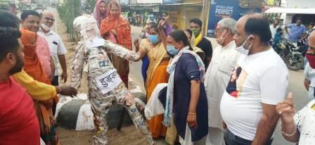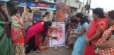 महिला विरोधी कृत्य करने पर भाजपा महिला मोर्चा ने कांग्रेस नेता का पूतला जलाया