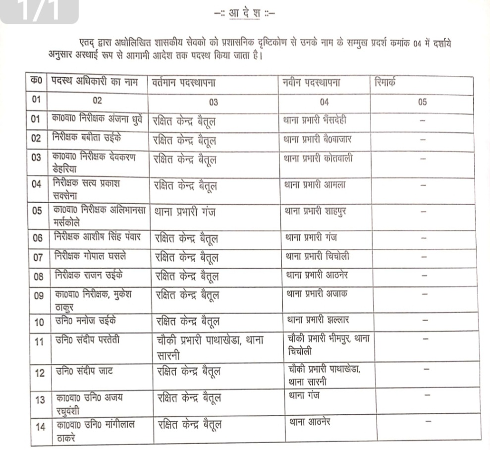 बैतूल। पुलिस महकमे में हुए तबादलों कई थाना प्रभारियों का तबादला बैतूल से बाहर हुआ था। बाहर से बैतूल आये अधिकारियो को नई पदस्थापना दी […]