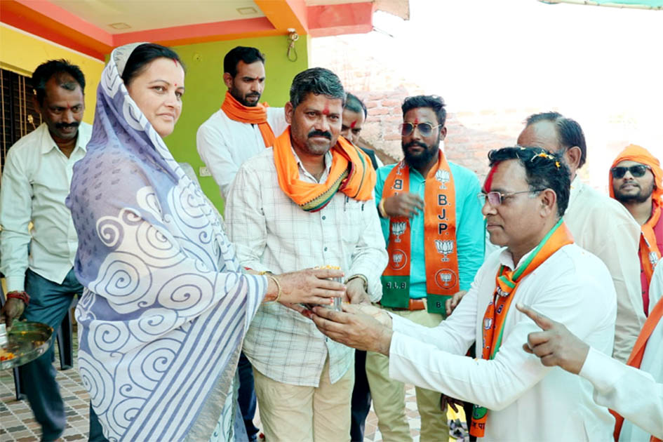 भाजपा प्रत्याशी डॉ. योगेश पंडाग्रे को महिलाओं ने सौंपी मक्का