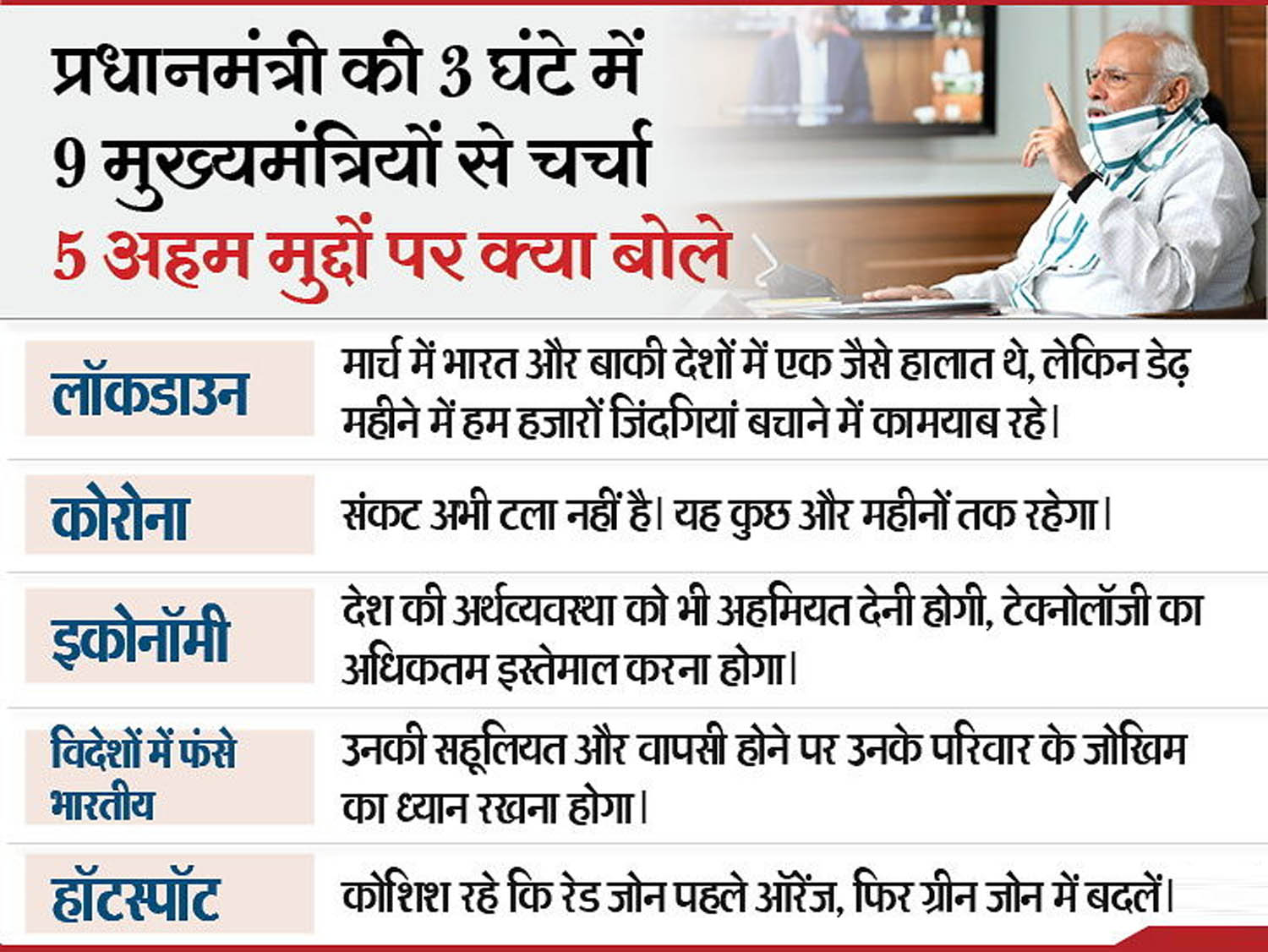 - चर्चा के दौरान प्रधानमंत्री ने लॉकडाउन बढ़ाने के संकेत तो नहीं दिए, लेकिन राज्यों के बीच कोरोना के गैर-हॉटस्पॉट वाले इलाकों में आर्थिक गतिविधियां शुरू करने और हॉटस्पॉट वाले इलाकों में लाॅकडाउन के सख्ती से पालन पर सहमति बनी।