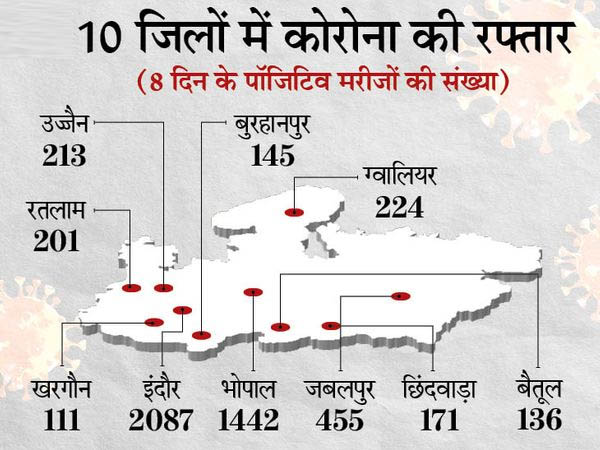 इंदौर और भोपाल में सबसे तेजी से संक्रमण फैल रहा है। इंदौर में मरीजों का आंकड़ा एक बार फिर 300 के पार पहुंच गया है। यहां 2 महीने 26 दिन बाद 302 केस मिले हैं। इसी तरह भोपाल में 3 महीने 7 दिन बाद एक दिन में 203 पॉजिटिव मरीज मिले हैं। संक्रमितों की संख्या बढ़ने का एक आधार टेस्टिंग बढ़ना भी है। दो दिन पहले तक 18 हजार तक टेस्ट हो रहे थे, लेकिन 18 मार्च को संख्या बढ़ा कर 20,770 की गई। ऐसे में संक्रमितों की संख्या भी बढ़ गई।CM शिवराज सिंह चौहान ने शुक्रवार को कोरोना की समीक्षा बैठक में यह निर्देश दिए।